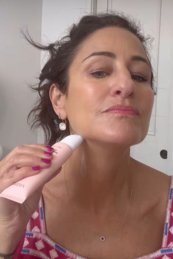 To stimulate lymphatic drainage, begin by massaging the centre of your neck in upwards motions, then across your jawline, and down the side of your neck. Repeat 4-5 times, then move on to the other side.
