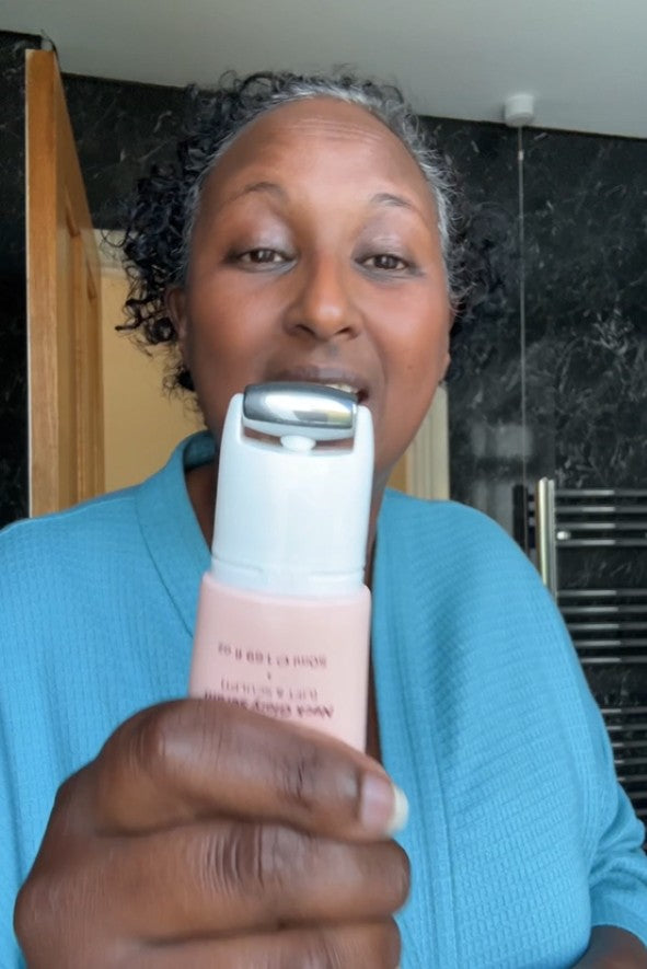 Medical-grade stainless-steel roller cools and massages skin, while our collagen-boosting cream, formulated with two plant-based collagens helps hydrate, firm and tighten loose skin, for a smoother texture.